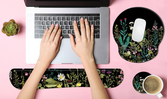 3 in 1 Ergonomic Mouse Pad with Wrist Support and Keyboard Wrist Rest Pad Set with Coaster, Wrist Pad with Non-Slip Rubber Base & Raised Memory Foam, Easy Typing & Pain Relief, Garden Flowers